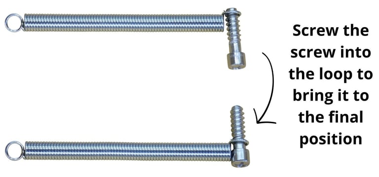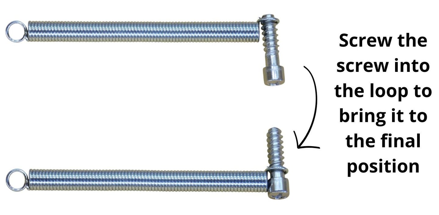 2) Place the screw at the end where the loop is not centered with the spring (from the inside out).
