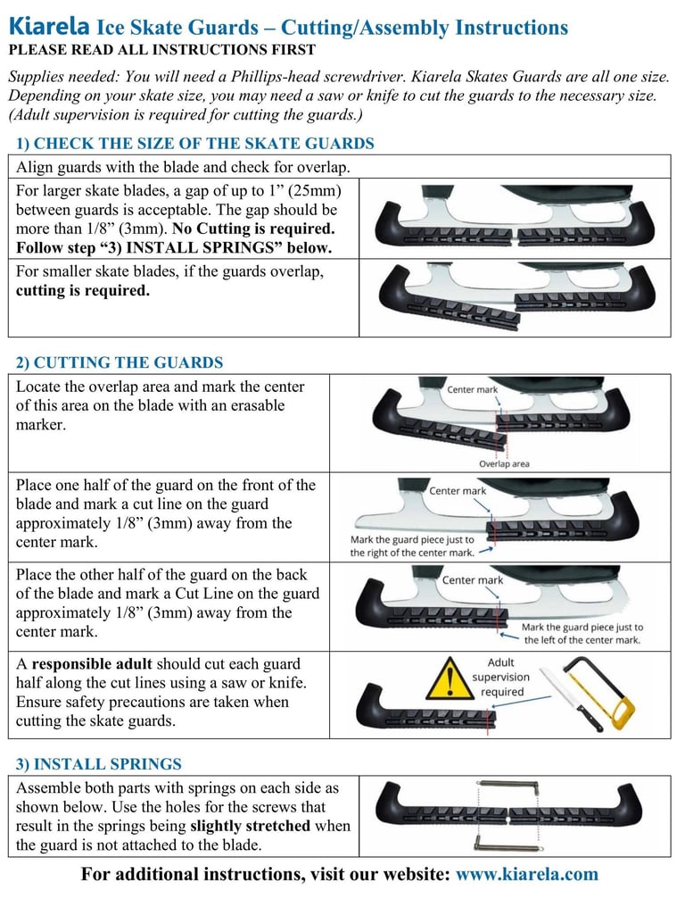 Assembly of the skate guards is straightforward, with four plastic pieces, springs, and Phillips-head screws included. Simply screw in the four screws to secure the guards. No washers, nuts or small parts that can get lost. You may need to trim the plastic pieces to fit your blade size perfectly; detailed cutting instructions are provided to ensure a secure and customized fit.